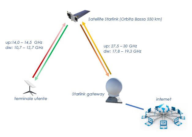 - downlink utenza: banda Ku: 10,7 – 12,7 GHz e in futuro banda V: 37,5 – 42,5 GHz