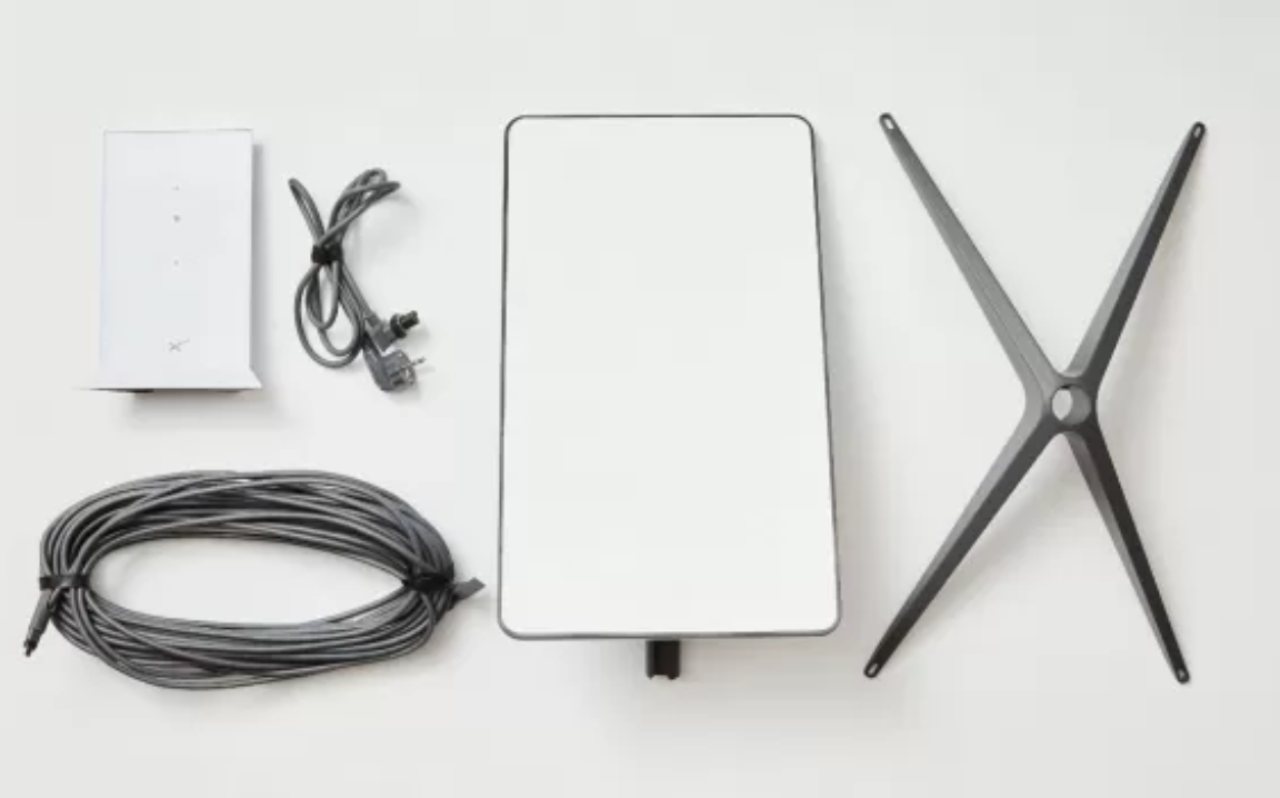 Il kit utente è costituito da una antenna rettangolare, di dimensioni e peso contenuti (50 x 30 cm - 4,5 kg), da un router wifi e da accessori quali una base metallica e un cavo Ethernet lungo 23 m cablato con connettori stagni propietari.